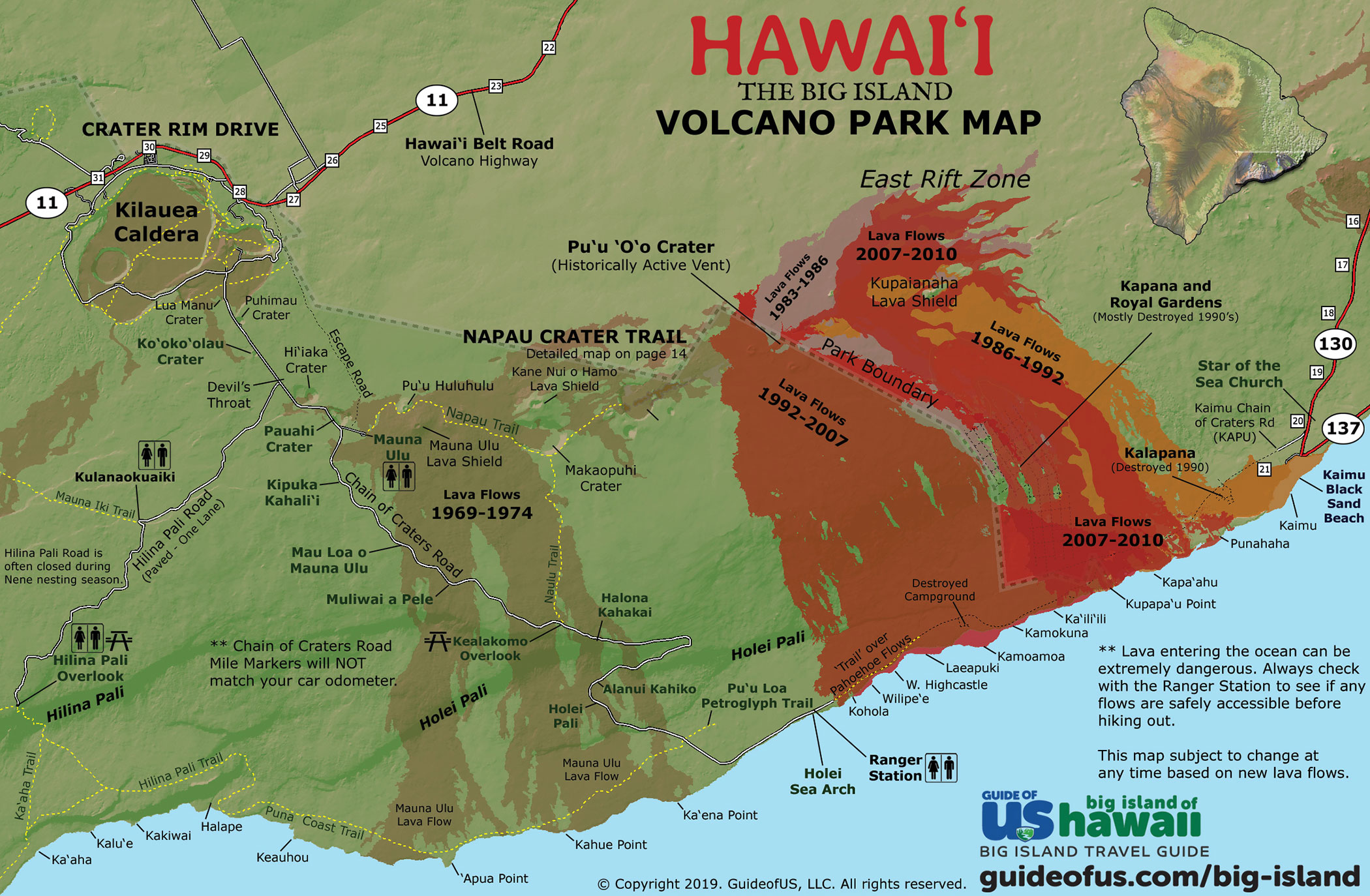 Check THIS SITE for updates on lava flows and Kilauea activity. We've also included some maps below to generally help provide you an overview of the park and where the lava might be located during your visit. Just remember, this is an active living and breathing volcano and things regularly change, the maps are always out of date for that reason to some extent.