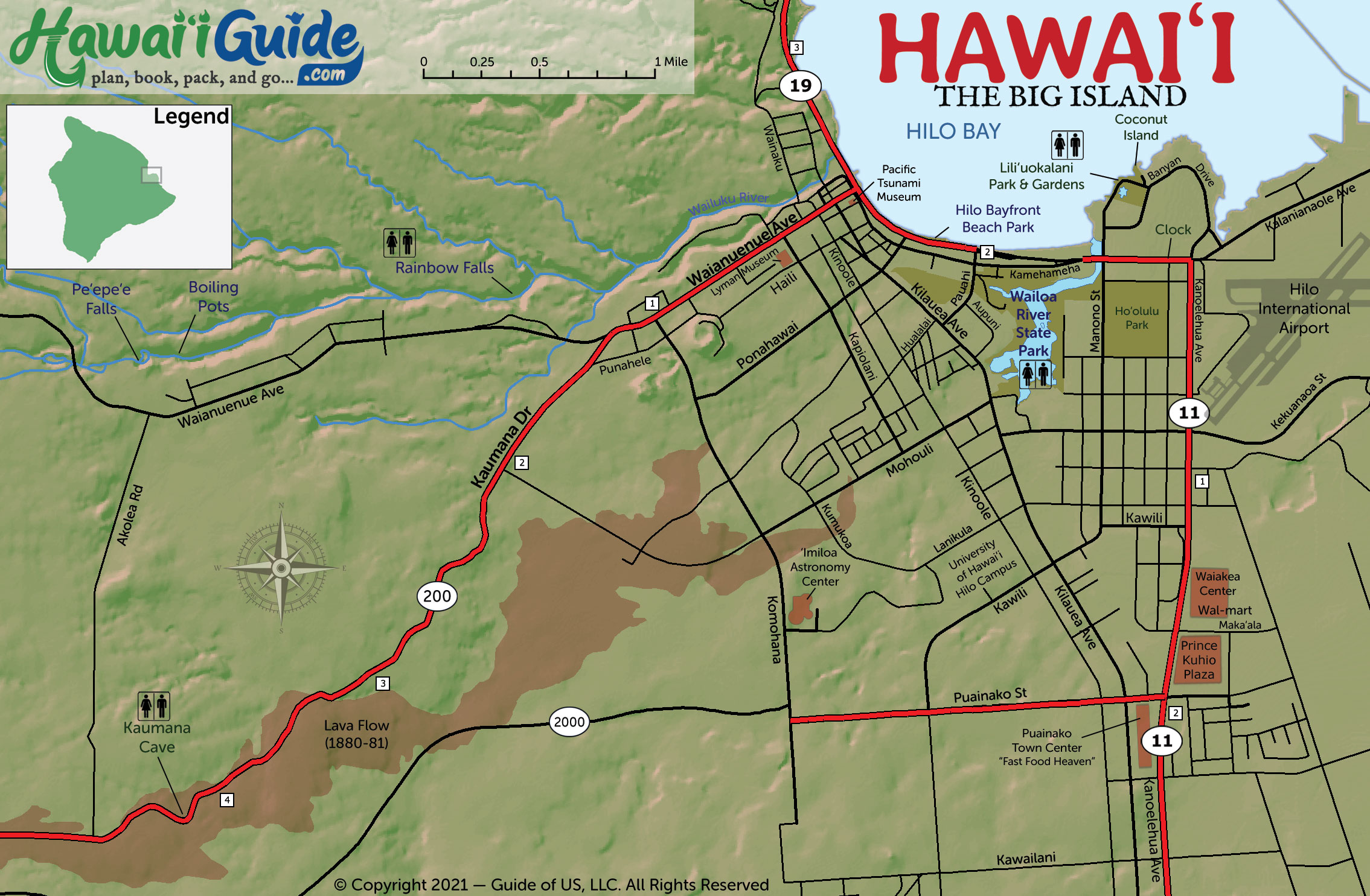 We've also included a zoomed-out overview map, that shows more of the area as a whole, including some of the popular attractions in the outer limits of the Hilo area.