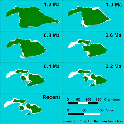 Though the Big Island of Hawai'i may seem incredibly large compared to its predecessors in the chain, in all likelihood it is not that much larger at all (historically speaking). Just across the 'Alenuihaha Channel sits the island of Maui and it's the greatest volcano, Haleakala. Geologists suspect that at one time Haleakala was not only joined to the West Maui Mountains, like today, but also was a single landmass combined with the islands of Lana'i, Moloka'i, and Kaho'olawe -- known as Maui Nui (literally, big Maui) (view map). The submergence of Maui Nui resulted in the volcanic body moved away from the Hawaiian hot spot. The lack of volcanic upbuilding combined with continued subsidence into the ocean floor eventually sank portions of the large island into the Pacific, providing us with the four separate islands we see today.