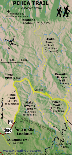 To help clarify this junction and the two trails, we've created three maps: one is a Pihea Trail map alone, one an Alakai Swamp Trail map alone, and one that shows the preferred route that combines the two (from Pu`u o Kila at the end of Highway 550 to Kilohana lookout), here known as the Pihea and Alakai Junction Trail map.