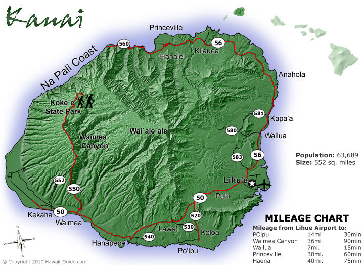 Updated with a new high-resolution Kauai map. Includes most major attractions, all major routes, airports, and a chart with estimated Kauai driving times.